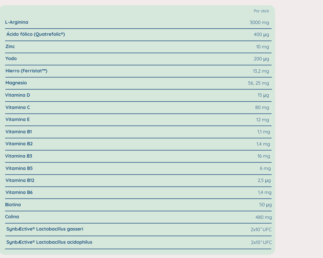 Clorhidrato de L-arginina, bitartrato de colina, magnesio (bisglicinato de magnesio y óxido de magnesio), aroma a piña, antiaglomerante (dióxido de silicio), hierro [Ferristat™ (EDTA férrico sódico)], vitamina C (ácido L-ascórbico), zinc (gluconato de zinc), agente de carga (lactitol), vitamina E (acetato de DL-alfa-tocoferilo), edulcorante (sucralosa), niacina (nicotinamida), SynbÆctive® Lactobacillus gasseri LG050, SynbÆctive® Lactobacillus acidophilus PBS066, ácido pantoténico (D-pantotenato cálcico), vitamina D (colecalciferol), vitamina B12 (cianocobalamina), vitamina B6 (clorhidrato de piridoxina), riboflavina (riboflavina), tiamina (mononitrato de tiamina), ácido fólico [Quatrefolic® (ácido (6S)-5-metiltetrahidrofólico, sal de glucosamina)], yodo (yoduro de potasio), biotina (D-biotina).
